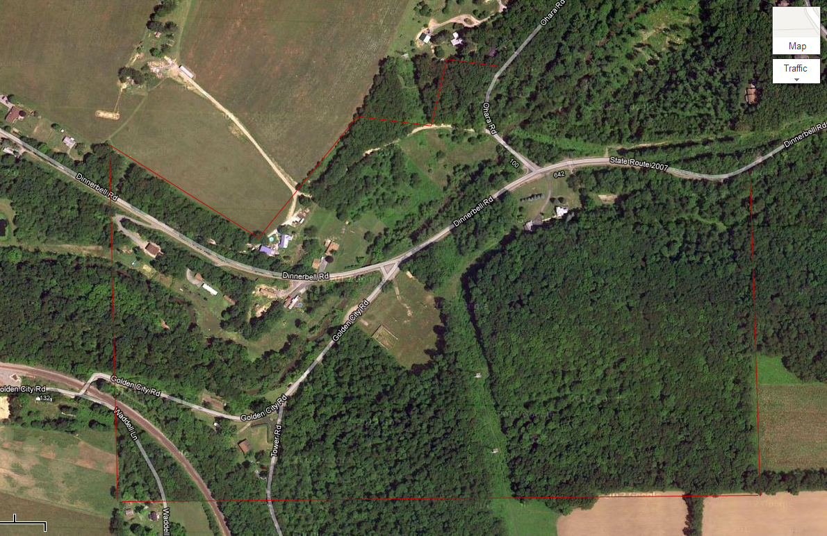 Satellite image of showing an outline of the Bauer’s main property upon which sat Bauer’s Mill in what is now Jefferson Township, Butler County, Pennsylvania.